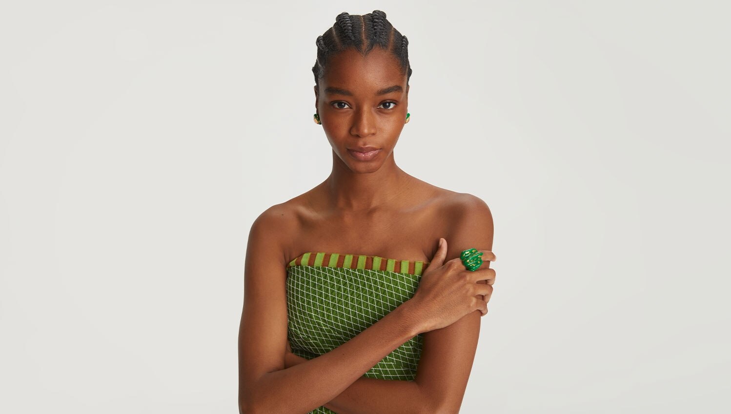 An update on a cocktail ring, our painted resin design takes an organic form in a bright emerald green, accented with gold