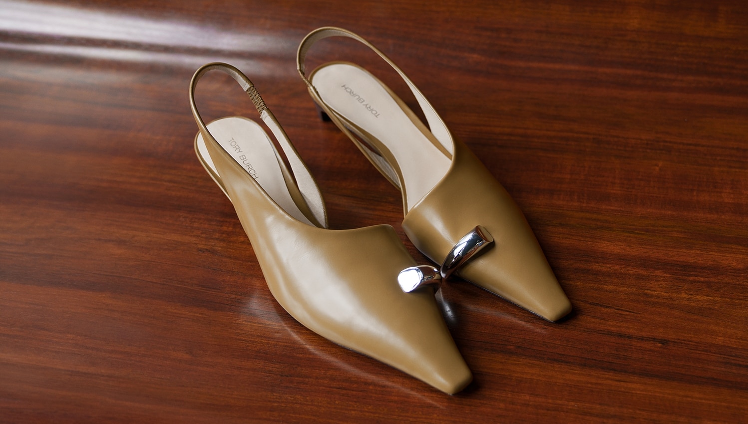 The new slingback is crafted in sleek leather with brass hardware creating the illusion of a pierced toe