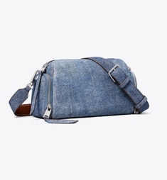 PERRY DENIM-PRINT SUEDE VOYAGER CROSSBODY BAG