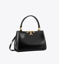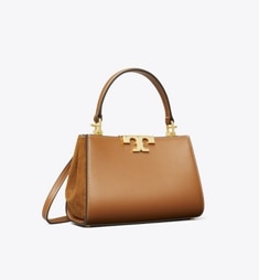 A jewel of craftsmanship. The cool combination of restraint and opulence. Set against clean lines, the bold curves of sculptural hardware embellished with pavé crystal. Our Mini Eleanor Satchel is made of leather with suede trim. The interior has a center divide and flap pocket for organization. Carry by the top handle or removable crossbody strap.