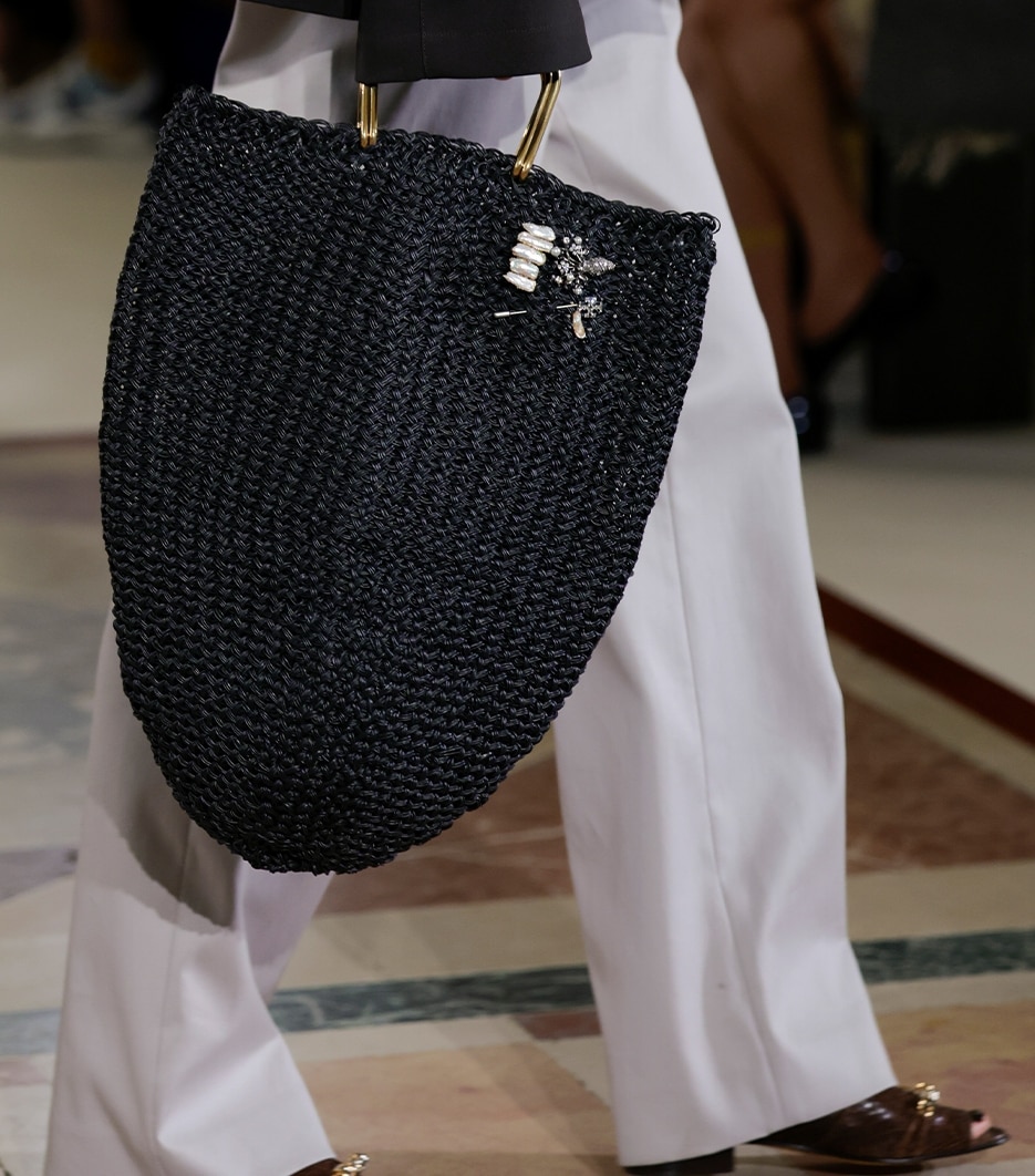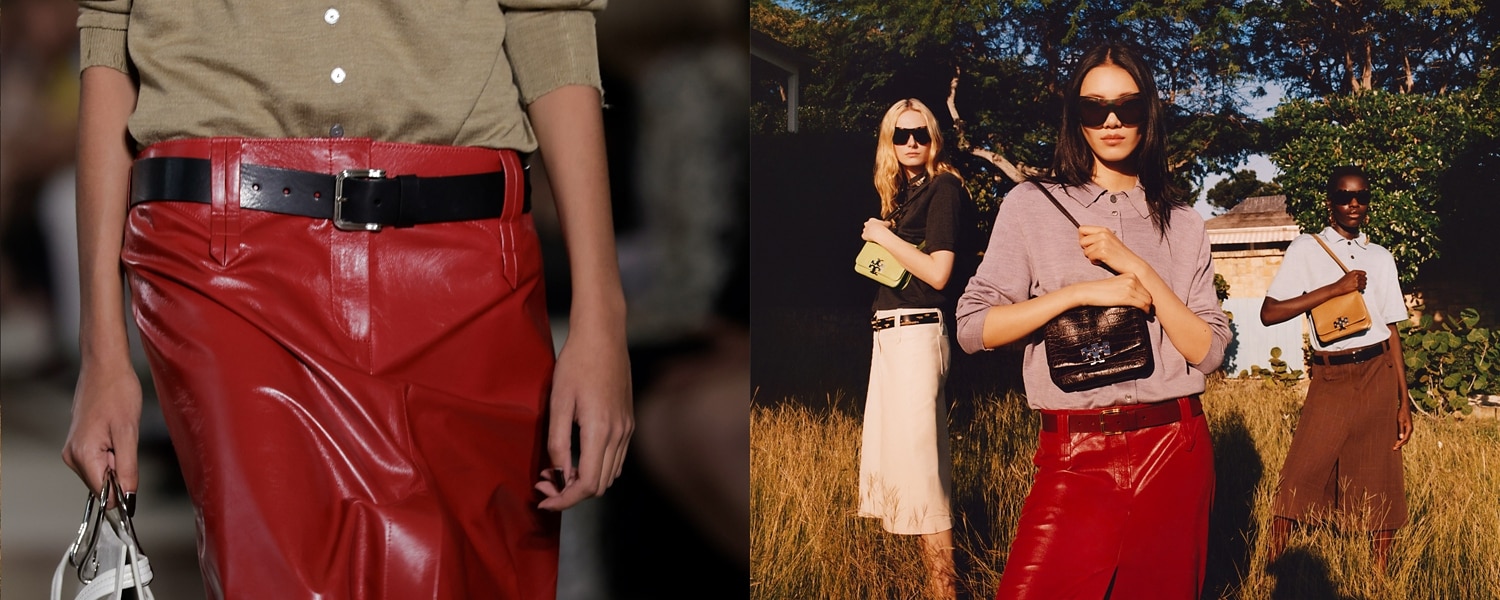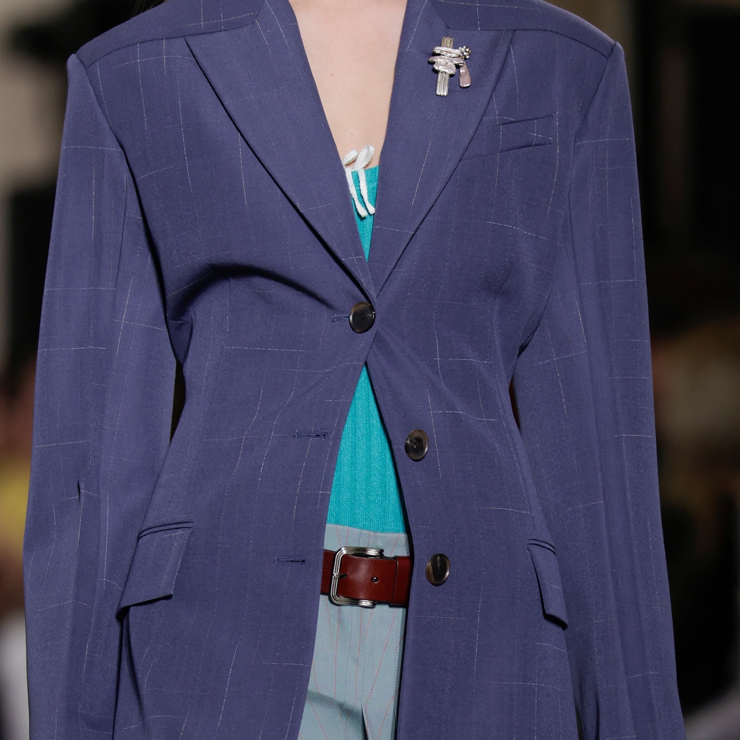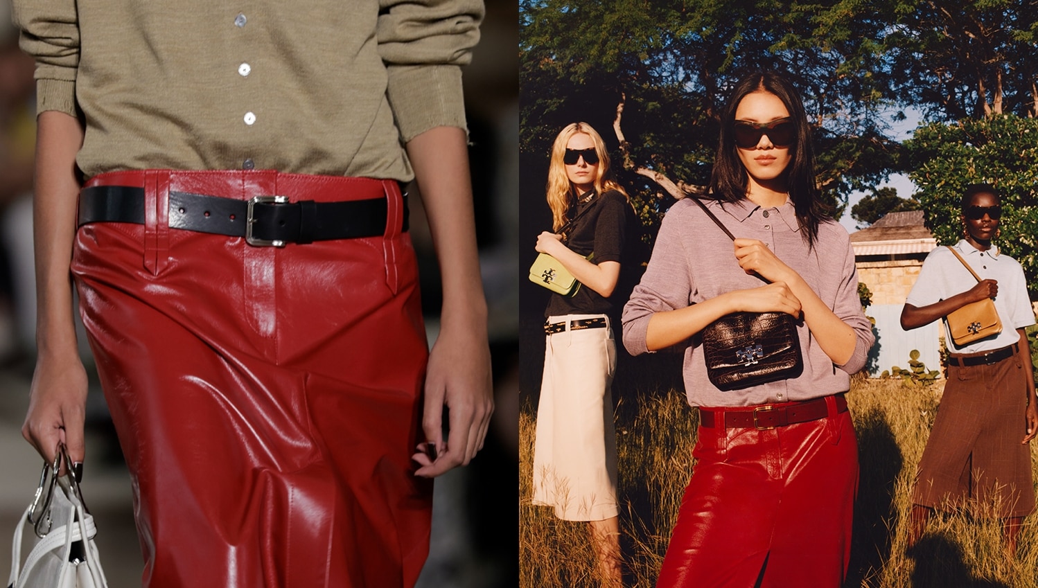Sharp tailoring plays off the fluid movement of a soft knit and flared skirt